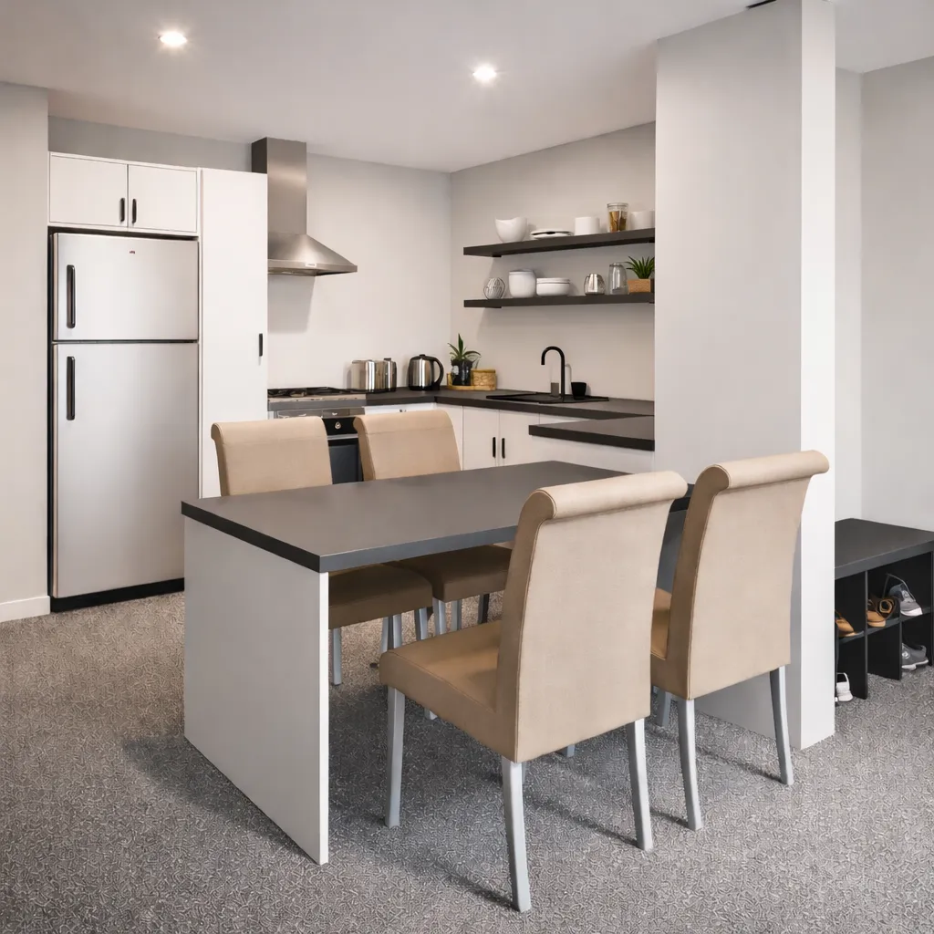 open plan living & kitchen area with integrated dining table